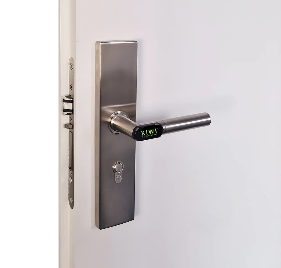 Die KIWI Klinke eignet sich für nicht-elektrifizierte Wohnungs- und Kellertüren. Sie wird über Batterien mit Strom versorgt. Ein wechselbares Einsteckschloss mit Einfachverriegelung ist Voraussetzungen für den Einbau.